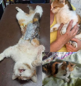 So, und die Mama des Duos ist jetzt erkrankt und hat einen Tumor am Bauch, der sehr schnell wuchs. Somit musste Martha schnell handeln und brachte sie zum Tierarzt. Auf dem linken Foto ist sie frisch operiert, rechts oben kuschelt sie mit Martha und rechts unten: so schaut sie aus …